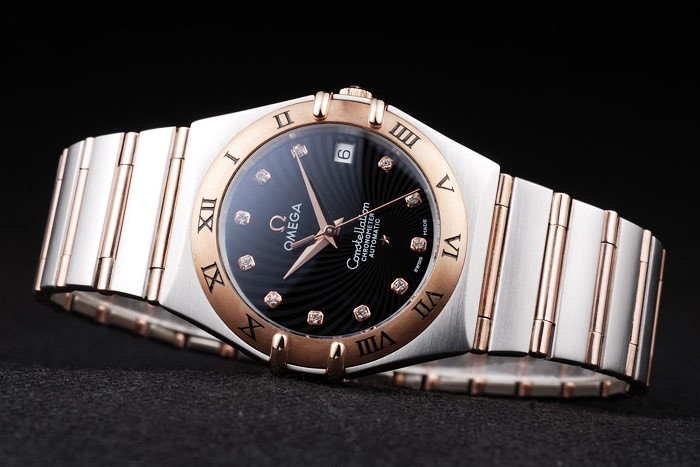 Case: acero inoxidable cepillado y oro rosa eslabón de la cadena de pulsera con cierre oculto y el logotipo de Omega en top
