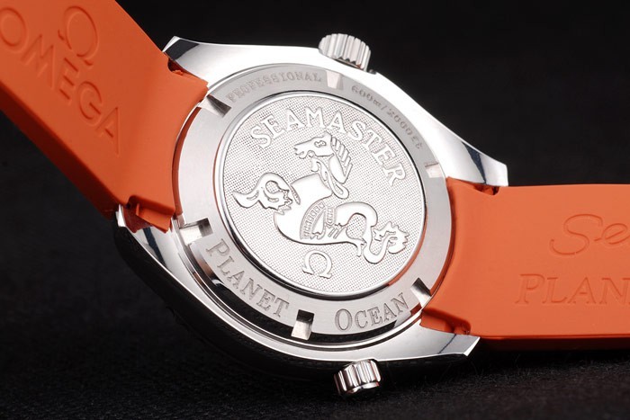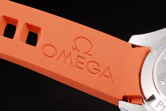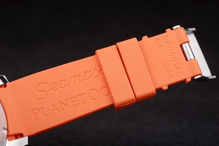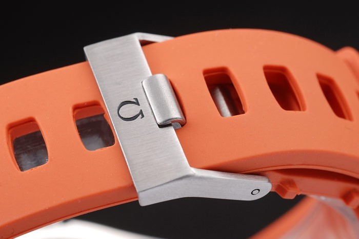 Bracelet: correa de caucho naranja con el sello de Omega y acero inoxidable cepillado de gancho hebilla de cierre con el logotipo de Omega en top