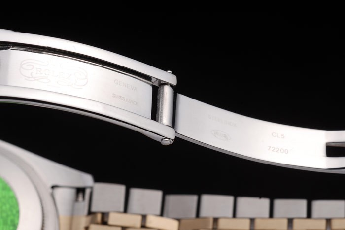Bracelet de acero inoxidable: Acero Dos brazalete de eslabones de tonos de acero inoxidable cepillado y oro amarillo de 18K plateado con Rolex grabado cierre oculto mostrando la longitud Rolex logo