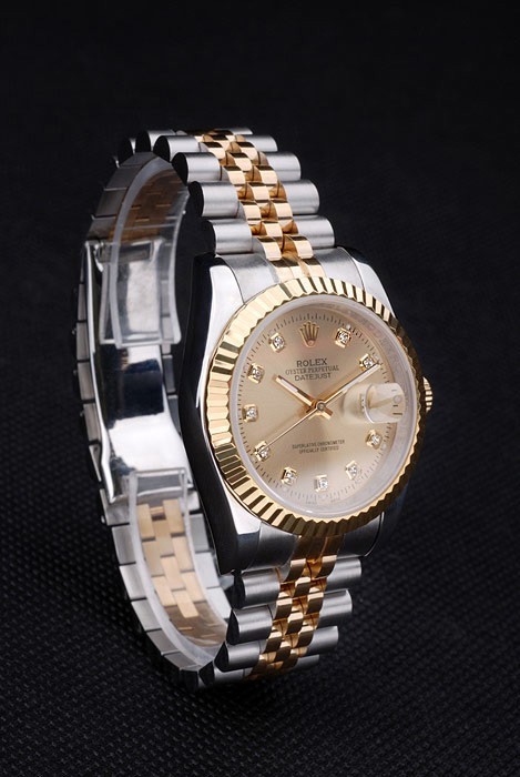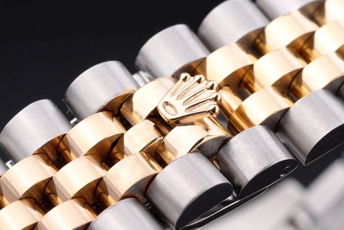 Bracelet de acero inoxidable: Dos brazalete de eslabones de tonos de acero inoxidable pulido y oro amarillo de 18K chapado en acero con cierre oculto grabado Rolex mostrando la longitud Rolex logo