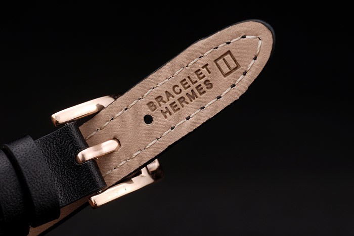 Bracelet: alargado correa de cuero negro con el sello en relieve calor y la pulsera de Hermes Hermes grabado oro rosa plateado gancho hebilla de cierre