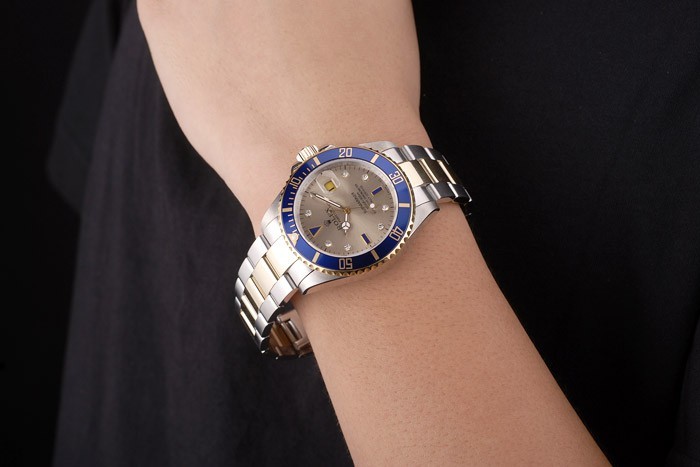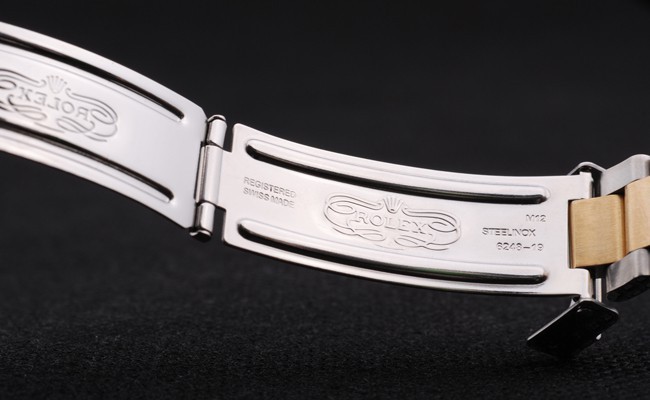 Bracelet: Dos tonos tono brazalete de eslabones de acero inoxidable cepillado y oro con el grabado Rolex doblar por la hebilla mostrando el Rolex logo