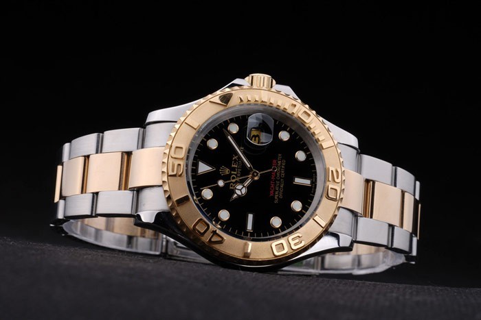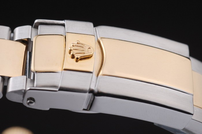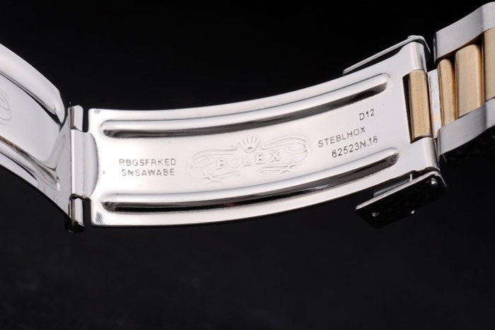 Bracelet: Dos tonos brazalete de eslabones de acero inoxidable cepillado y tono de oro con el grabado Rolex doblar por la hebilla mostrando el Rolex logo