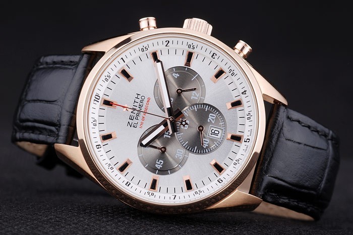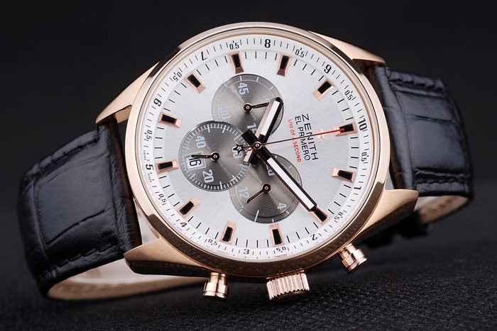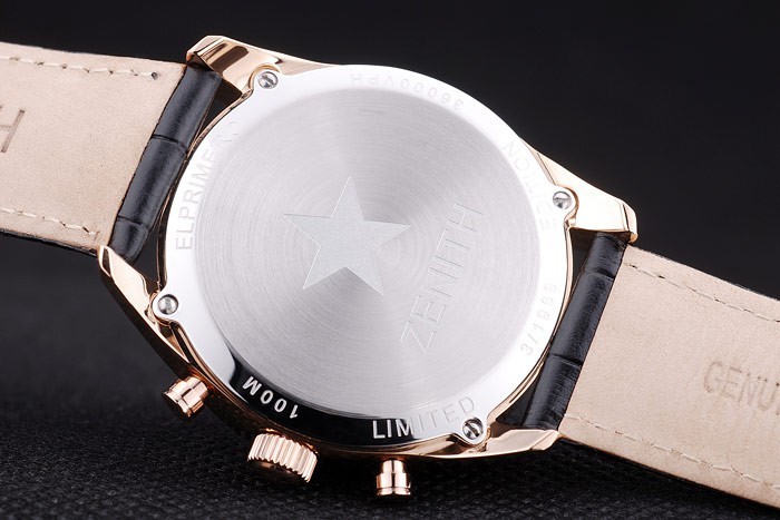 Crown: Rose-chapado en oro de la corona calado con logotipo de la estrella Zenith dos pulsadores coronas circulares más pequeñas a cada lado y grabado de it